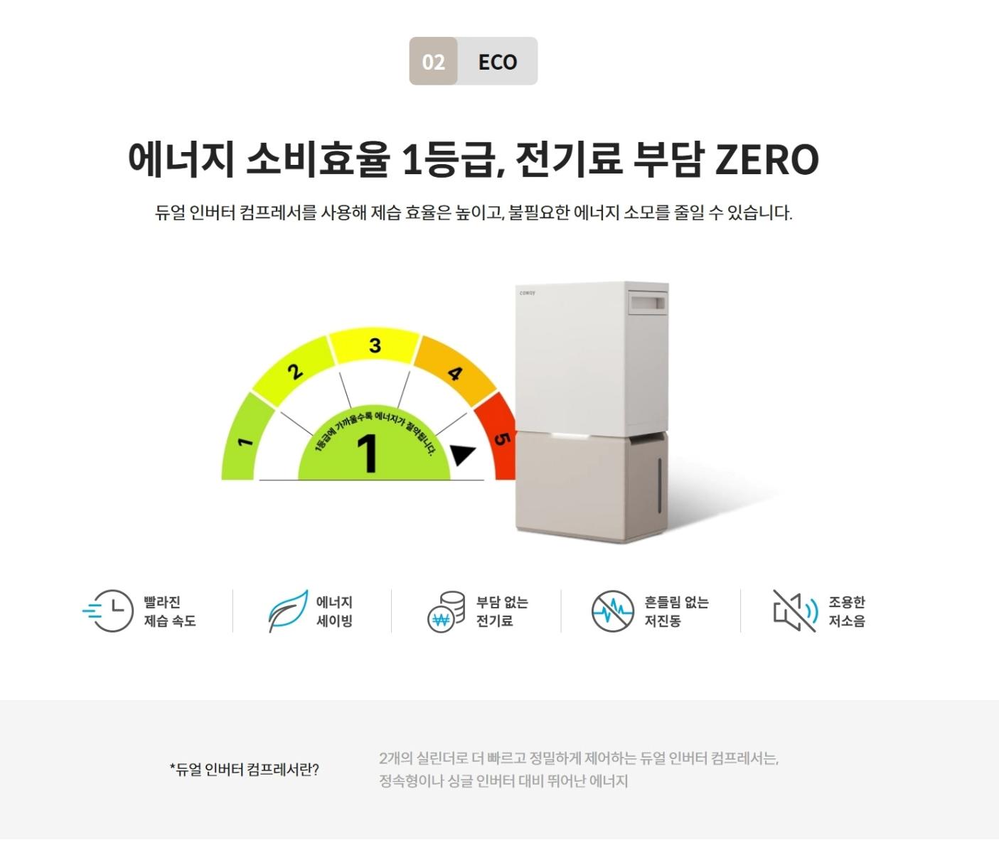 듀얼 인버터 컴프레서를 사용해 제습 효율은 높이고,